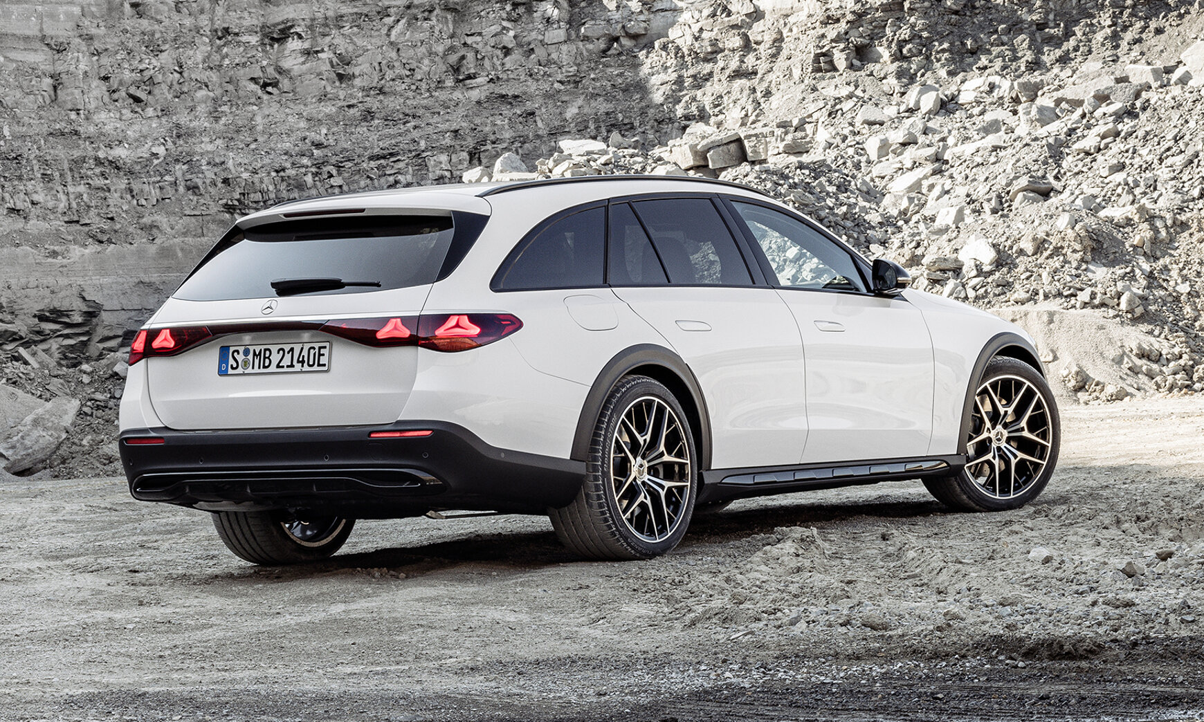 De E-Klasse All-Terrain onderscheidt zich door zijn robuuste en stijlvolle design. De specifieke grille, ontworpen met twee lamellen in iridiumzilver en een geïntegreerde ster, geeft de auto een kenmerkende uitstraling. Aan de zijkant vallen de donkergrijze wielkastbekledingen op, terwijl de chroomkleurige onderrijbeveiliging en dorpelverbreders het geheel afmaken. Het interieur is luxueus afgewerkt met roestvrijstalen AMG-sportpedalen en speciale vloermatten met het ‘All-Terrain’ opschrift.